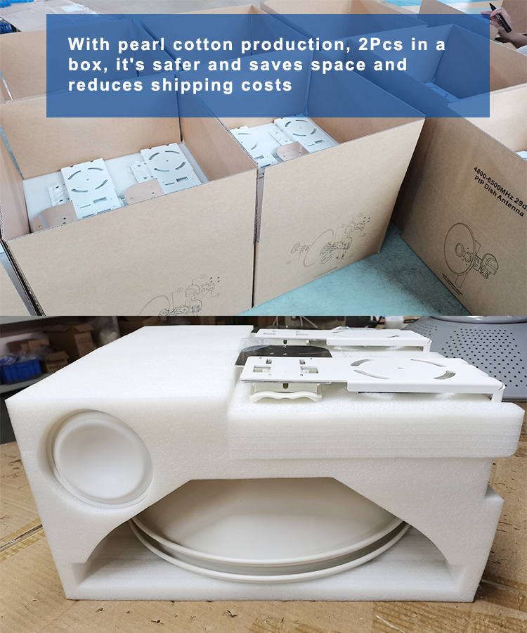The model XJS-DP-D4865-29X is a compact high performance 5GHz MIMO parabolic antenna. Its diameter is only 42cm but it has a high gain of 29dBi. It is suitable for outdoor remote point-to-point signal transmission to solve the problem of remote signal reception or transmission. XJS Technology uses a new design that makes the antenna smaller than many other antennas on the market, but at the same time maintains high gain and high performance. The antenna has a wide frequency band and maintains good operation in the frequency range of 4800 to 6500MHz. This antenna uses ±45° polarization mode, which ensures the stable transmission of signals with less loss during signal transmission.